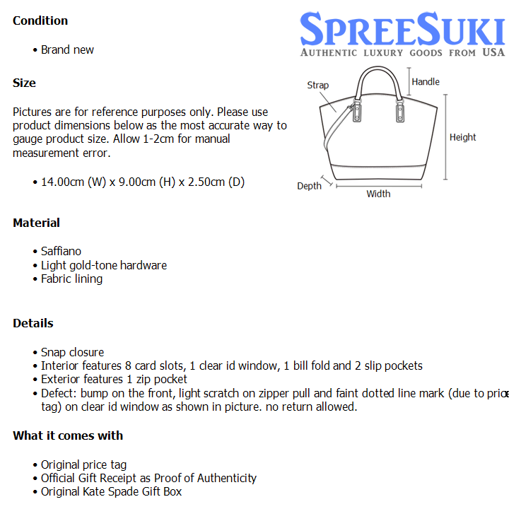 Defect: bump on the front, light scratch on zipper pull and faint dotted line mark (due to price tag) on clear id window as shown in picture. no return allowed.